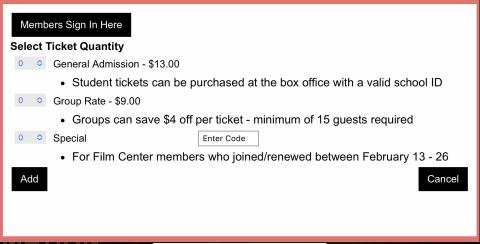 Dual level members are limited to two discounted tickets per screening.Note: The Film Center does not do partial refunds to reflect member discounts - if you are unable to unlock a discounted ticket, please do not purchase a General Admission ticket in lieu of your member ticket.