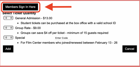 A window will pop up that will allow you to select your quantity of tickets. If you are a member, click “Members Sign In Here” to access your discounted ticket rate.